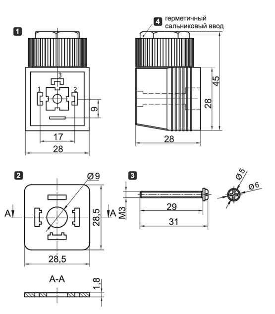 - - высокая степень защиты электрических соединений разъема (до IP65*) достигается благодаря наличию герметичного сальникового ввода для кабеля и прокладки-уплотнения со стороны катушки;