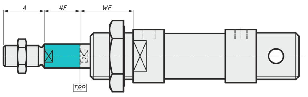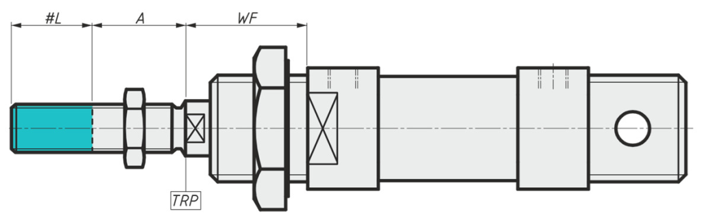 | Описание размеров | Размер от TRP (теоретической точки отсчёта) до плоскости передней крышки | Внутренняя резьба штока | Глубина внутренней резьбы штока | Длина резьбы штока | Величина удлинения штока | Величина удлинения наружной резьбы штока |