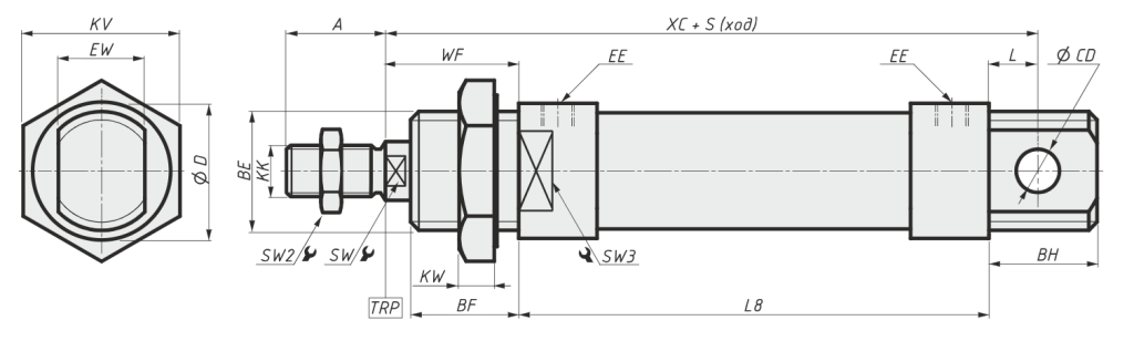 | KW | Ширина крепёжной гайки | L8 | Общая длина корпуса пневмоцилиндра |