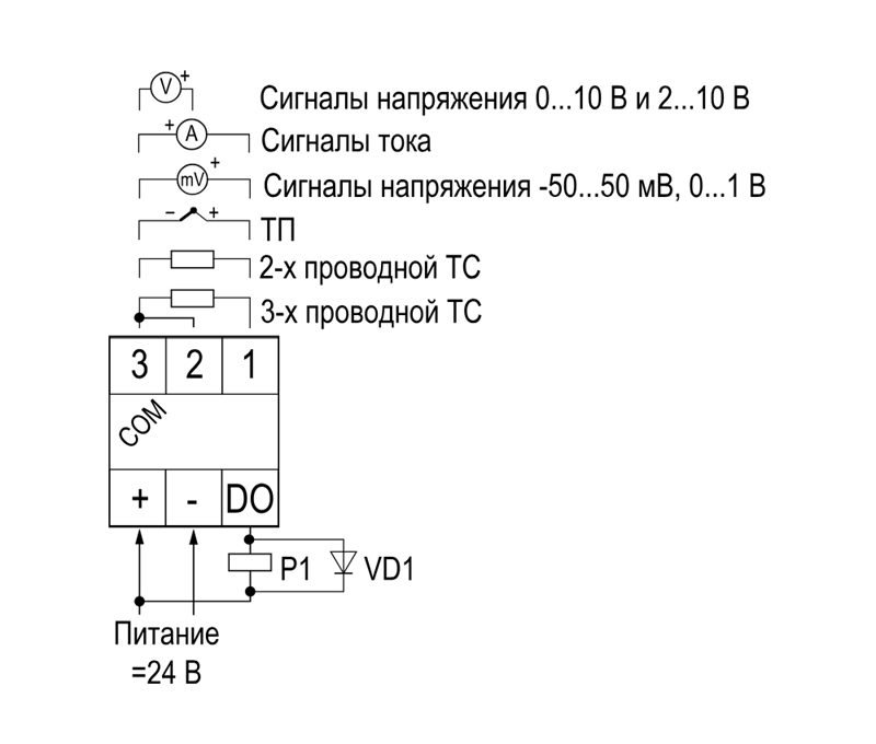 - Измеряет широкий спектр сигналов: ток, напряжение, термосопротивления, термопары, датчики давления/уровня/влажности/расхода и др.