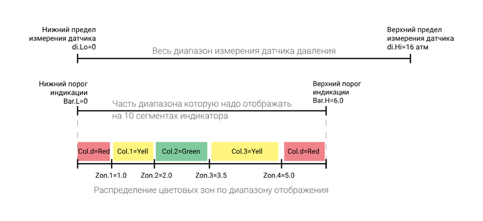 - Позволяет задавать произвольные значения границ смены цвета и выбирать цвет индикации для каждой зоны в пределах диапазона измерения.