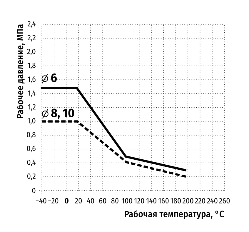 При повышении температуры снижается максимальное рабочее давление. Эксплуатация пневмотрубки либо при высоком давлении, либо при высокой температуре..