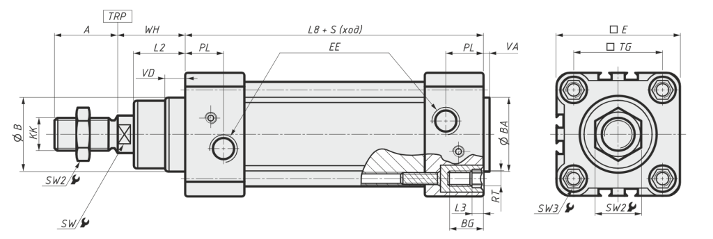 | BA | Диаметр выступающей части задней крышки | E | Ширина / Высота корпуса цилиндра |