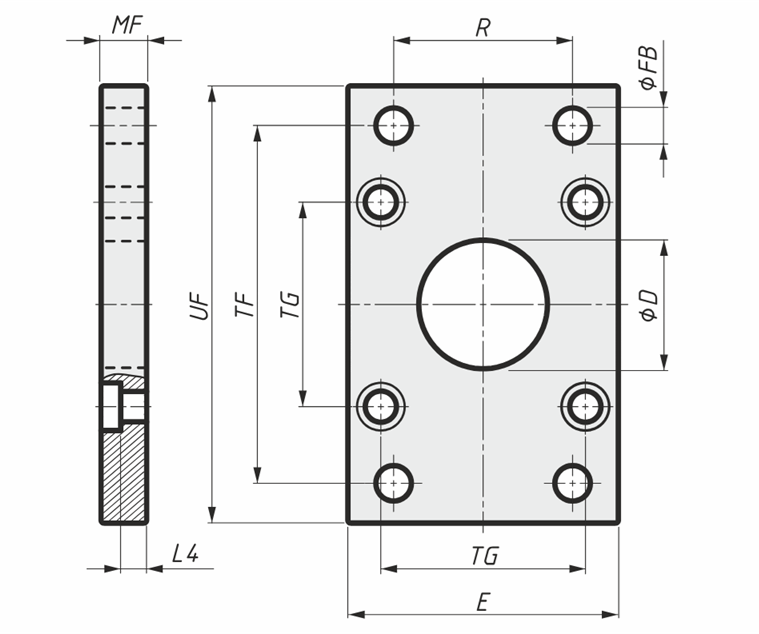 | для, ⌀ мм | ⌀ D мм | E мм | ⌀ FB мм | L4 мм | MF мм | R мм | TF мм | TG мм | UF мм | Обозначение |