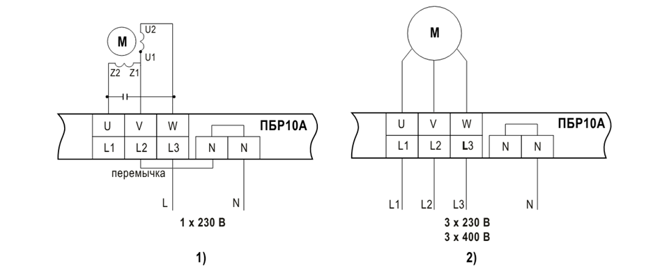 Схемы подключения однофазного (1) и трехфазного (2) двигателей |
