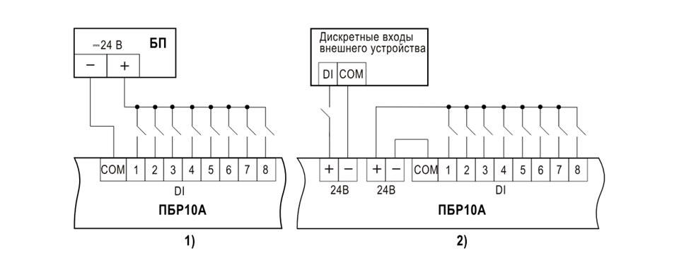 Схемы подключения дискретных входов к внешнему источнику питания (1) и ВИП (2) |