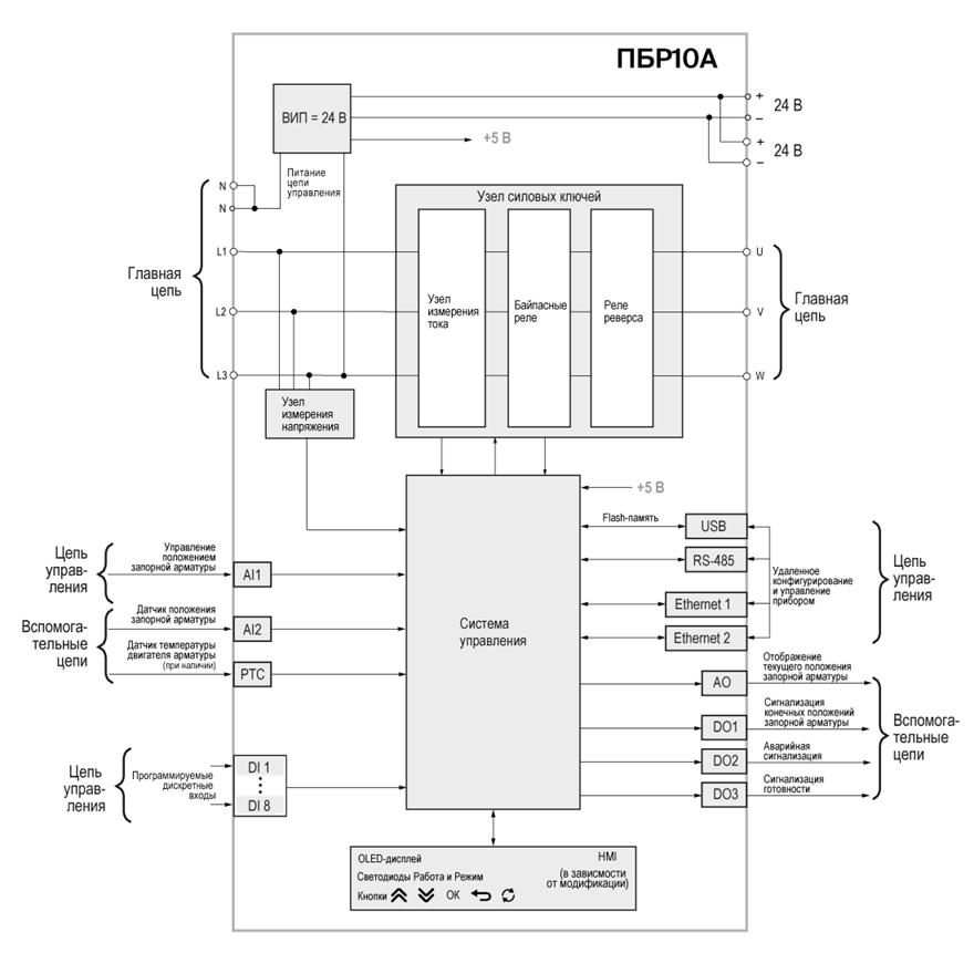 ПБР10А [М01] - это интеллектуальное решение для управления электродвигателями исполнительных механизмов в промышленных системах. Разработанный для автоматизации трубопроводной арматуры (клапаны, задвижки, МЭО, МЭОФ и другие приводы), он объединяет в одном компактном корпусе функции контроллера, устройства плавного пуска и многоуровневой защиты двигателя.