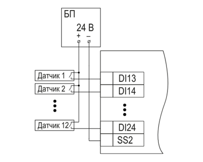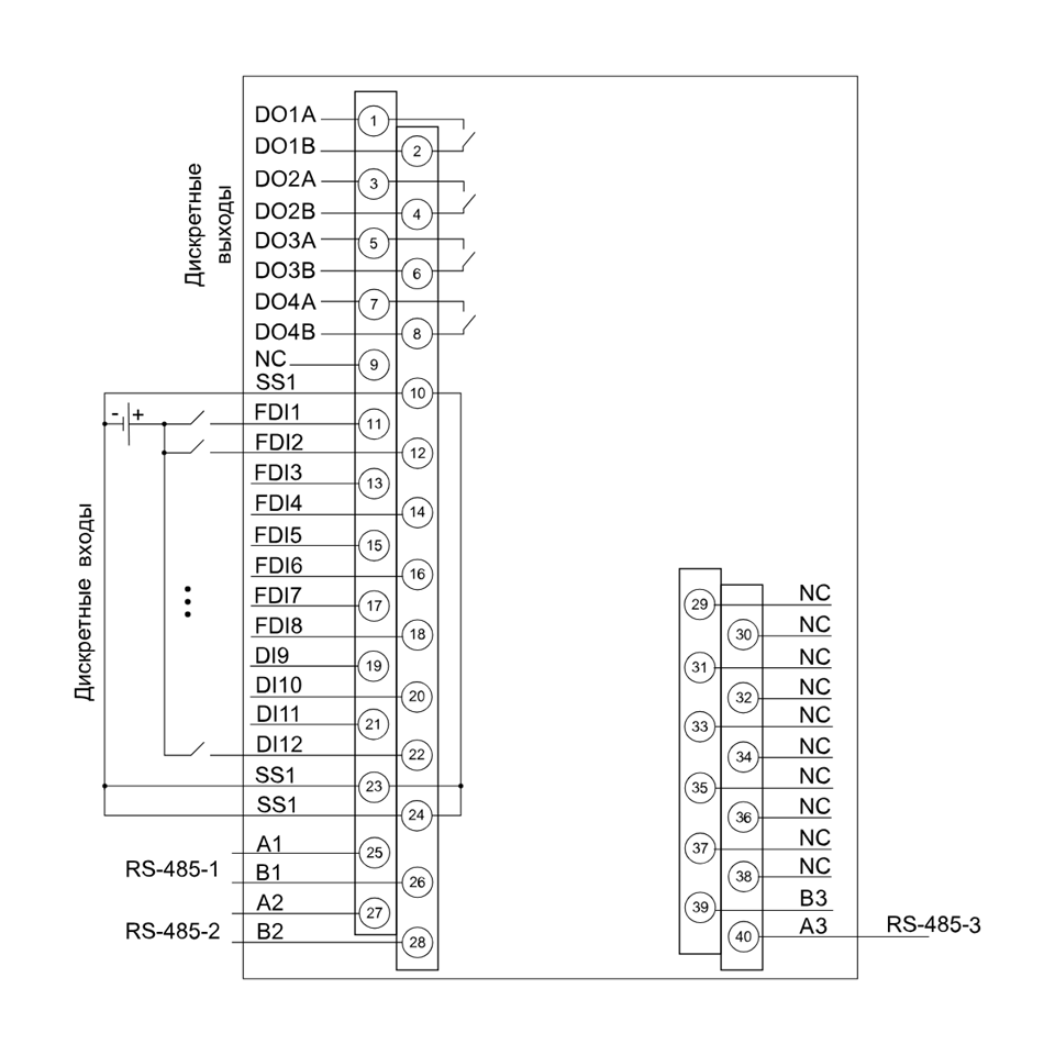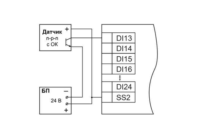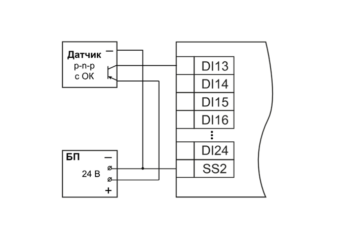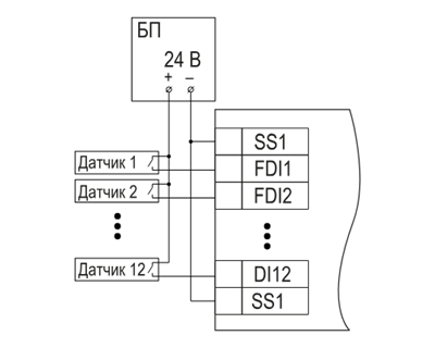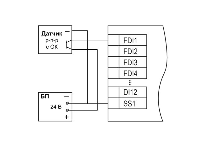 * Для подключения транзисторов типа n-p-n к быстрым дискретным входам FDI1–FDI12 следует использовать отдельный источник питания для входов. Клемма SS1 объединена со входом питания.