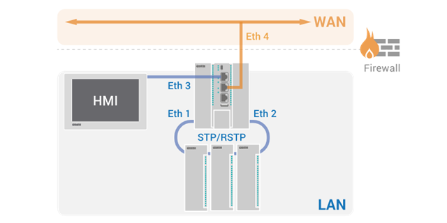 | Порты Ethernet 1, Ethernet 2 и Ethernet 3 объединены в мостовое подключение к локальной сети (LAN). Порт Ethernet 4 используется как отдельный изолированный сетевой интерфейс для подключения к глобальной сети (WAN), защищённый межсетевым экраном. Данная схема позволяет разделить сеть на две зоны, обеспечивая одно пространство IP-адресов для портов Ethernet 1-3. |