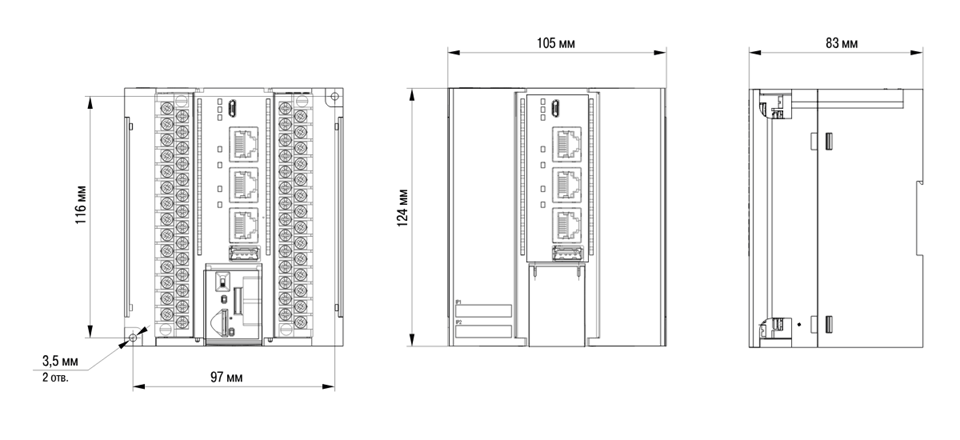 Основным коммуникационным интерфейсом является Ethernet. У контроллера 4 порта Ethernet, 3 из которых объединены в управляемый коммутатор.