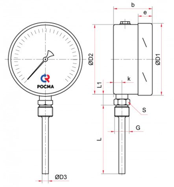 При монтаже прибора на трубопровод приваривается бобышка с внутренней резьбой. В бобышку вкручивается шток термометра. В случае использования термометра с защитной гильзой из нержавеющей стали на давление в системе до 25 МПа или 60 МПа, в бобышку вкручивается гильза, а в гильзу устанавливается термометр.